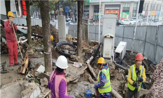 据悉,改造初期的最大难题并非挖路施工,而在多方“协调”。贵阳路地下已铺设电信、移动、联通、广电、供电、燃气、供水、排水等8类管线,地面涉及交通、公安、城管、公交、街道、社区等十余家单位,沿线还有大量商铺与居民。为确保改造工程顺利推进,项目组多次牵头召开管线综合调度会,组织各管线单位逐一现场交底、探明走向,解决了道路拓宽涉及的路权调整、绿化迁移、公交改线、交通管制等问题。为减少对临街商铺经营和居民出行的影响,项目组成立群众工作专班,采取“分段施工、快速恢复”模式推进,夜间进行大体积混凝土浇筑,白天恢复临时路面保障通行,并协助商户设置临时通道和指示牌,得到了群众的广泛支持与配合。