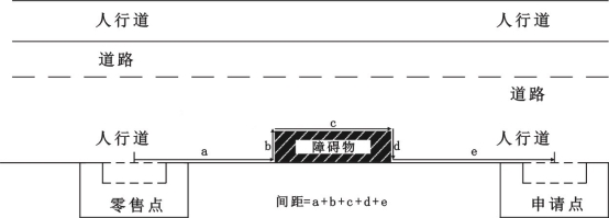 8.市场、封闭式小区内、广场等区域零售点间距测量方法均以原设计道路、人行通道行人正常安全行走的最短距离进行测量。