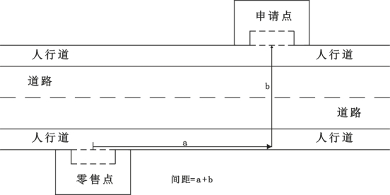 1.申请人的经营场所与最近零售点的经营场所同侧无障碍物的,测量最短直线距离。(如图1所示)