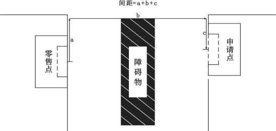 2.申请人的经营场所与最近零售点的经营场所同侧存在障碍物的,测量按直角分段绕过障碍物测量,分段距离之和即为申请人的经营场所与最近零售点的经营场所间的距离。(如图2所示)