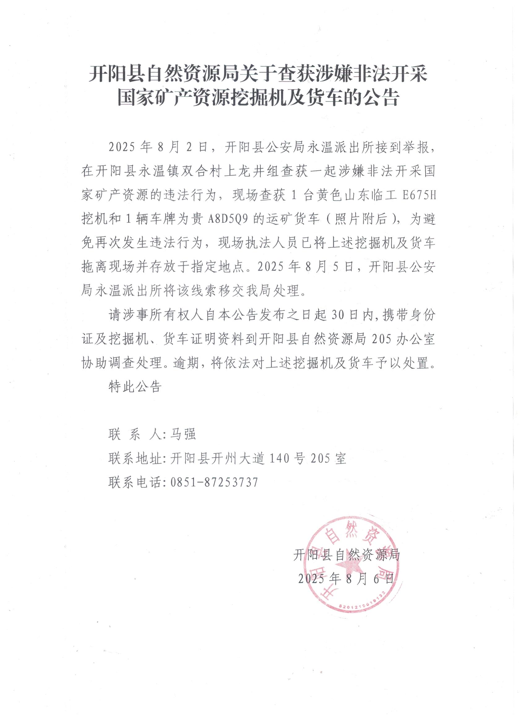 2025年8月2日,开阳县公安局永温派出所接到举报,在开阳县永温镇双合村上龙井组查获一起涉嫌非法开采国家矿产资源的违法行为,现场查获1台黄色山东临工E675H挖机和1辆车牌为贵A8D5Q9的运矿货车(照片附后),为避免再次发生违法行为,现场执法人员已将上述挖掘机及货车拖离现场并存放于指定地点。2025年8月5日,开阳县公安局永温派出所将该线索移交我局处理。