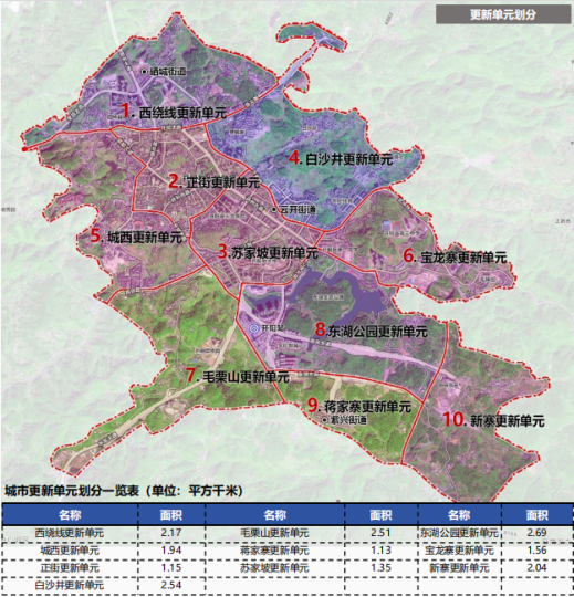 将更新范围划分为10个城市更新单元,单元面积在1~3平方公里,总体更新范围19.09平方公里。