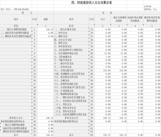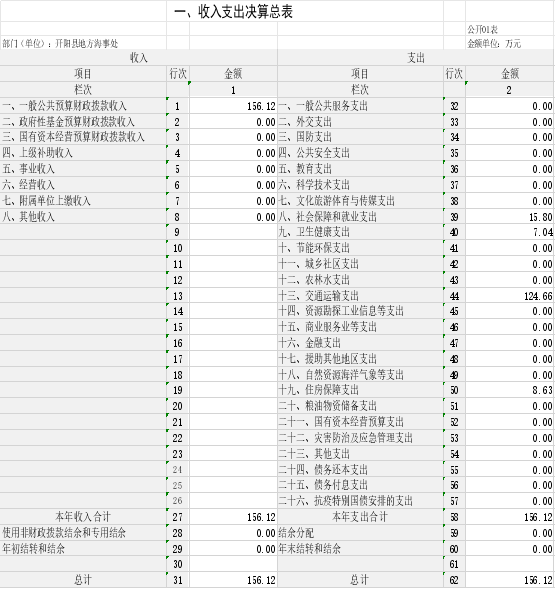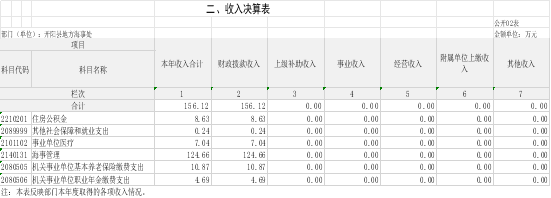 本年收入合计156.12万元,其中:财政拨款收入156.12万元,占100%;上级补助收入0万元,占0%;事业收入0万元,占0%;经营收入0万元,占0%;附属单位缴款0万元,占0%;其他收入0万元,占0%。