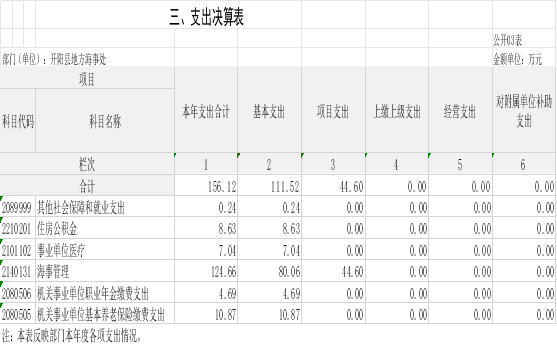 本年支出合计156.12万元,其中:基本支出111.52万元,占71.4%;项目支出44.6万元,占28.6%;上缴上级支出0万元,占0%;经营支出0万元,占0%;对附属单位补助支出0万元,占0%。
