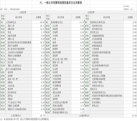 2023年度一般公共预算财政拨款基本支出156.12万元,其中:人员经费97.74万元,主要包括基本工资、津贴补贴、离退休费等;公用经费13.78万元,主要包括办公费、水电费、差旅费等。