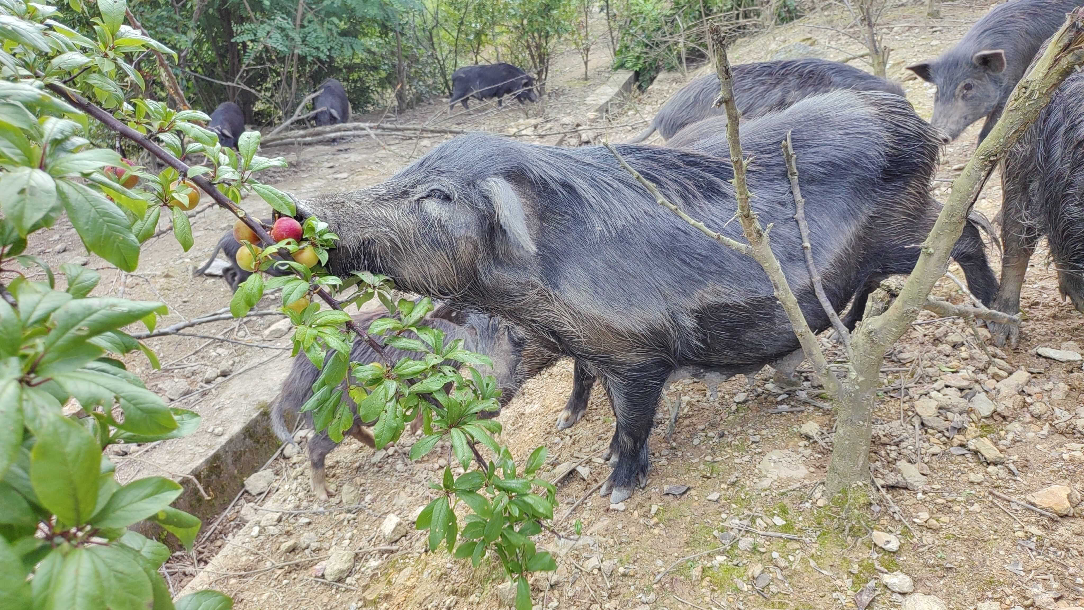 近日,走进开阳县楠木渡镇两路村,百来头毛色油黑发亮的猪从山林中奔跑出来,这些毛发黑长、健硕敦实的“二师兄们”,正是楠木渡镇以散养模式养殖的藏香猪。