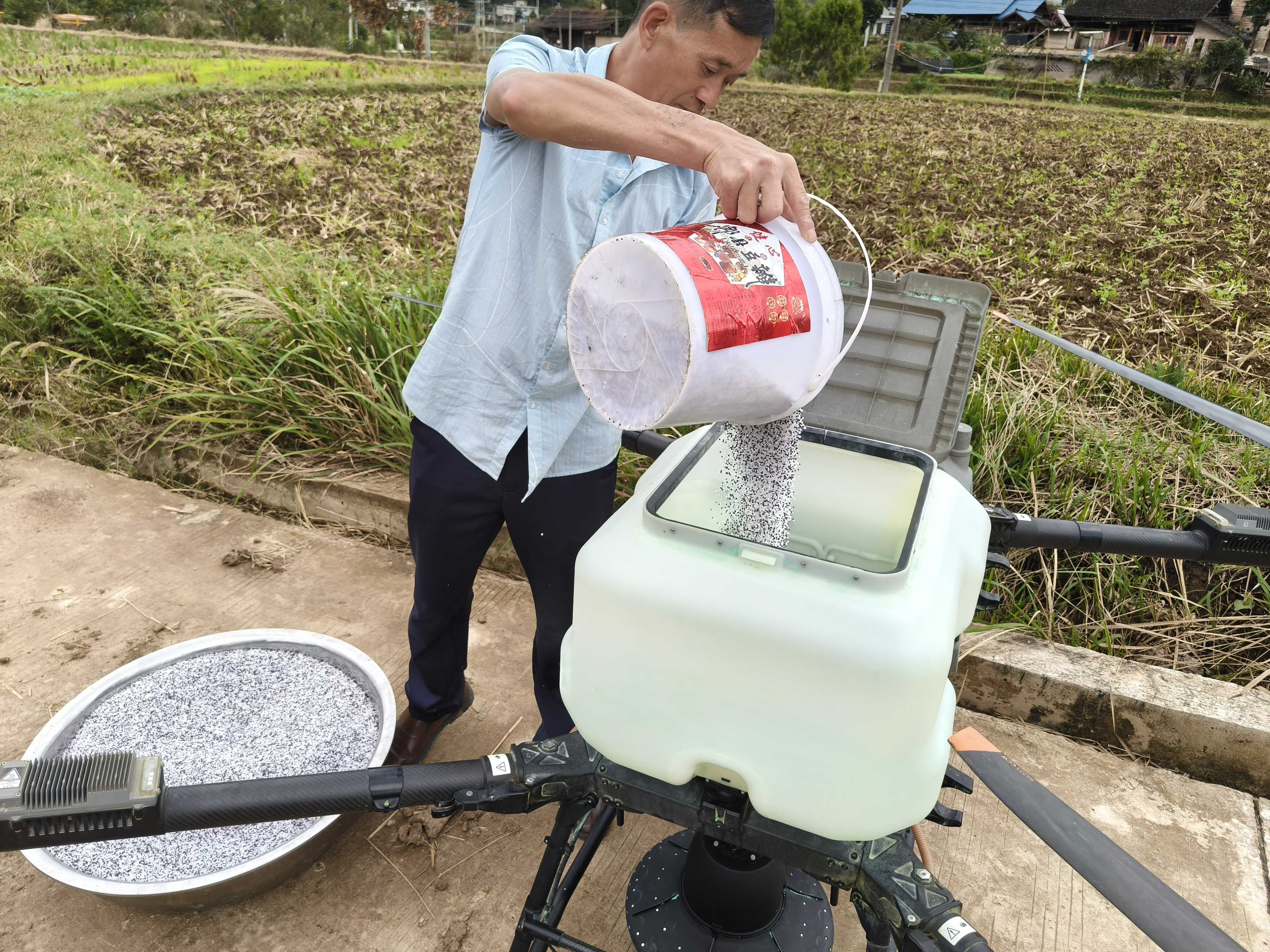 在这场与时间赛跑的生产活动中,科技已成为提升效率的“新质生产力”。十字村的田埂上,技术操作员正专注操控着无人机按照预设航线匀速飞行,将拌混好的油菜种子和肥料均匀播撒在刚收割完水稻的田块中,短短几小时,大片土地便完成了播种作业。