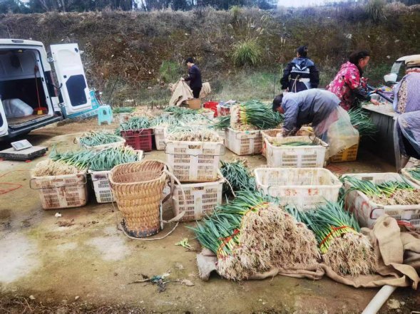 近日,宅吉乡高标准农田200亩蒜苗迎来采收,工人们忙碌的身影穿梭在田地间,熟练地起苗、清洗、捆绑、搬运、装框,收购的车辆早已候在一旁,打包的蒜苗正被陆续称重装车。