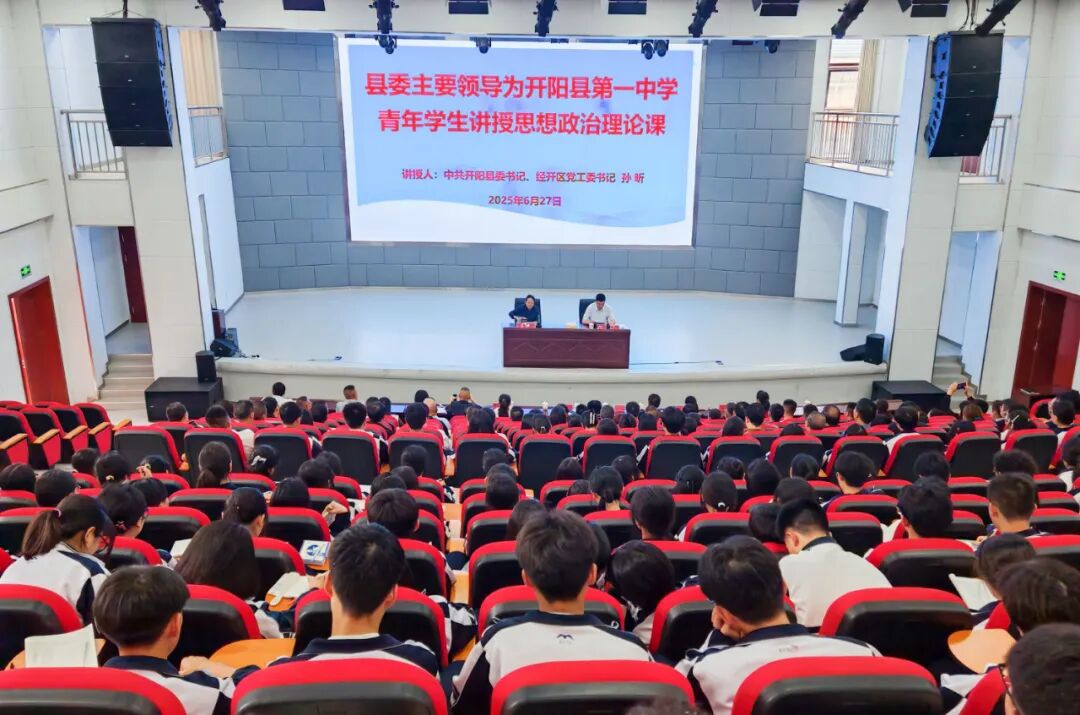 6月27日,县委书记、开阳经开区党工委书记孙昕到开阳县第一中学讲授思想政治理论课,和师生一起深入学习贯彻习近平总书记关于青年工作的重要思想和在贵州考察时的重要讲话精神,寄语青年学子坚定理想信念、厚植家国情怀、练就过硬本领、发扬奋斗精神,以青春之我、奋斗之我回应“青春与祖国同行”的时代命题。