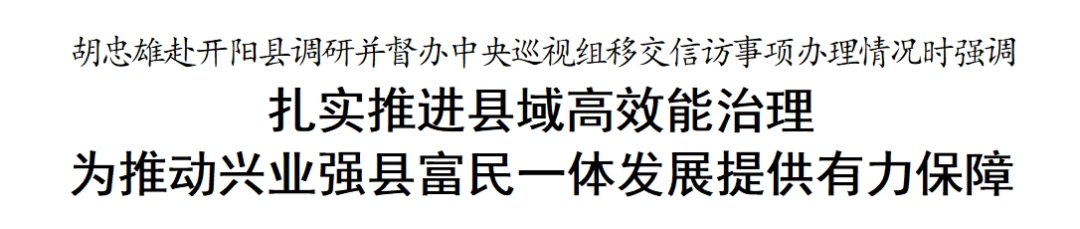 10月15日,省委常委、市委书记胡忠雄赴开阳县调研并督办中央巡视组移交信访事项办理情况。他强调,要深入学习贯彻习近平总书记在贵州考察时的重要讲话精神,扎实推进县域高效能治理,为推动兴业强县富民一体发展提供有力保障。