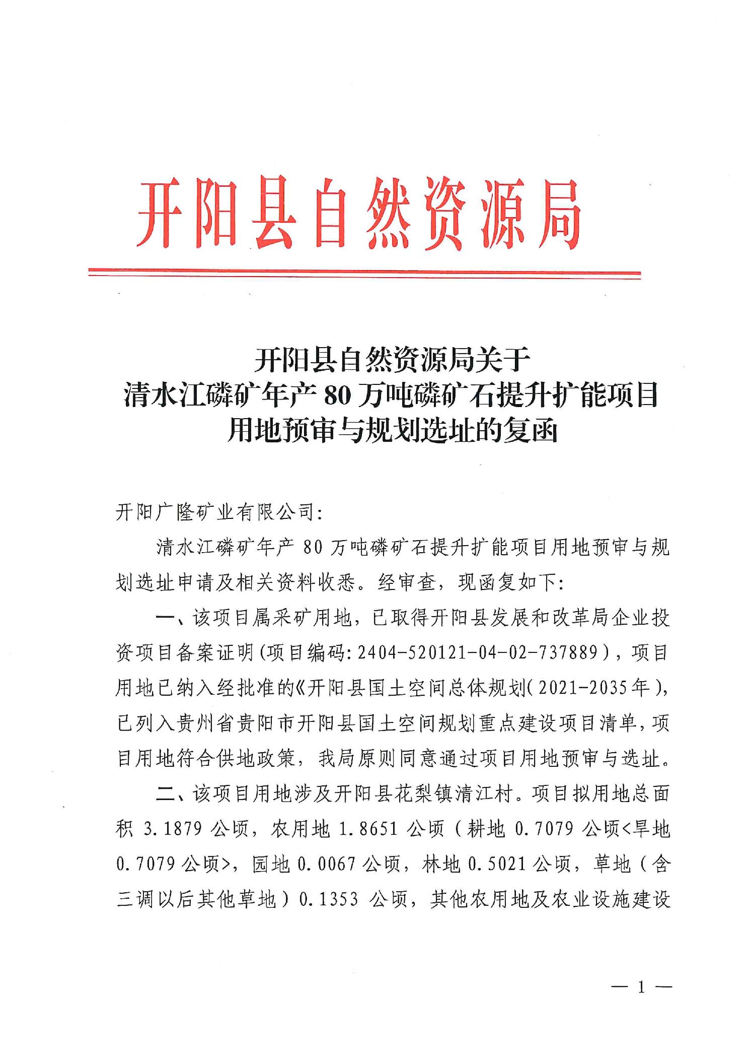 清水江磷矿年产80万吨磷矿石提升扩能项目用地预审与选址复函