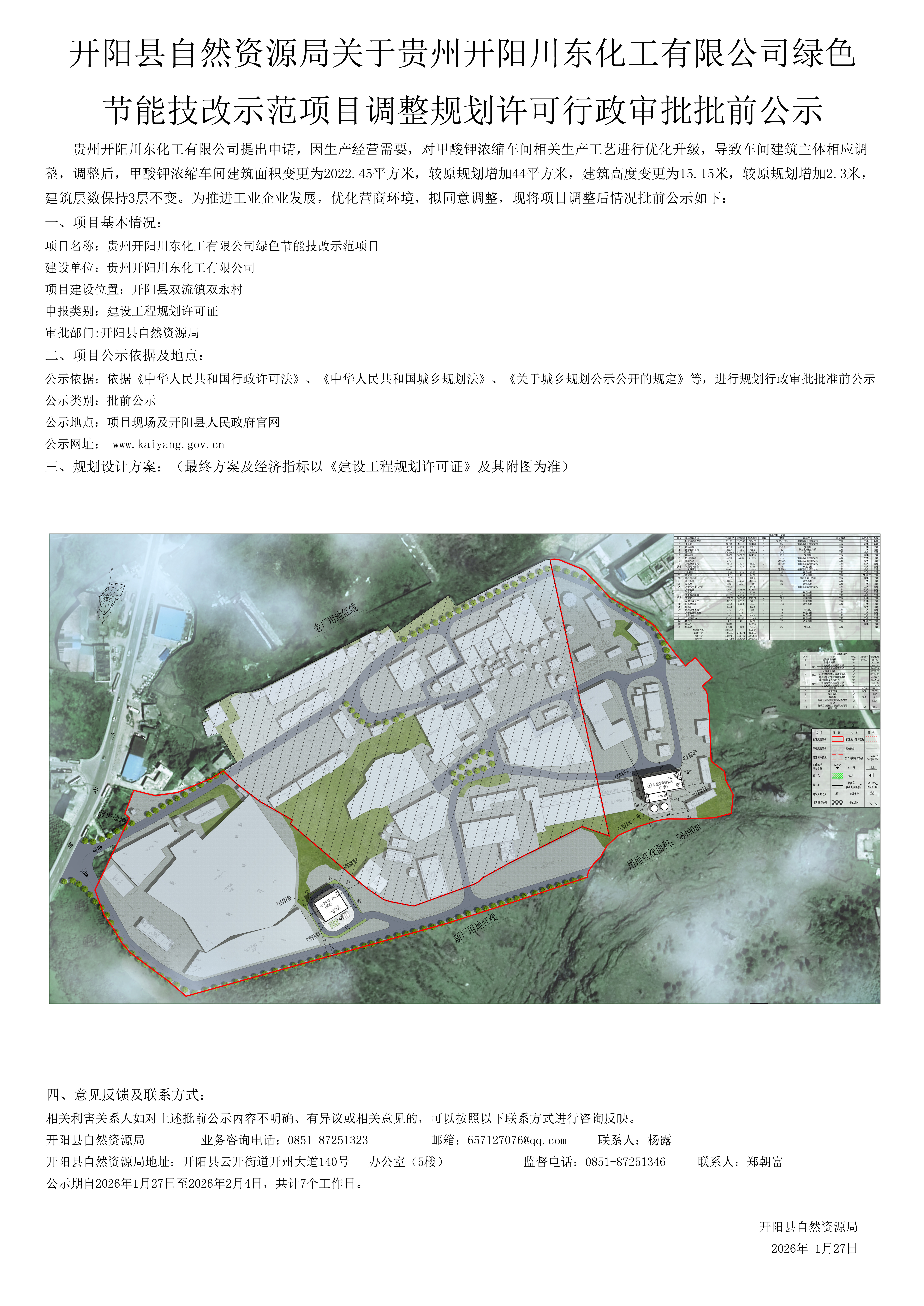 贵州开阳川东化工有限公司提出申请,因生产经营需要,对甲酸钾浓缩车间相关生产工艺进行优化升级,导致车间建筑主体相应调整,甲酸钾浓缩车间建筑面积变更为2022.45平方米,较原规划增加44平方米,建筑高度变更为15.15米,较原规划增加2.3米,建筑层数保持3层不变。为推进工业企业发展,优化营商环境,拟同意调整,现将项目调整后情况批前公示如下: