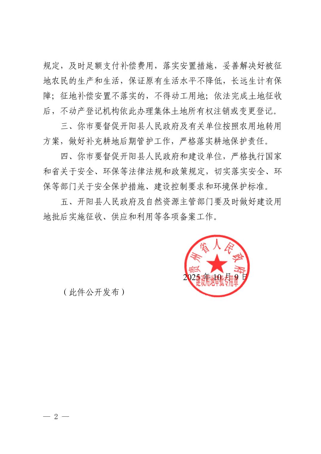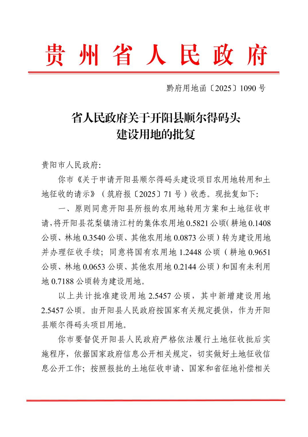 黔府用地函〔2025〕1090号 省人民政府关于开阳县顺尔得码头建设用地的批复