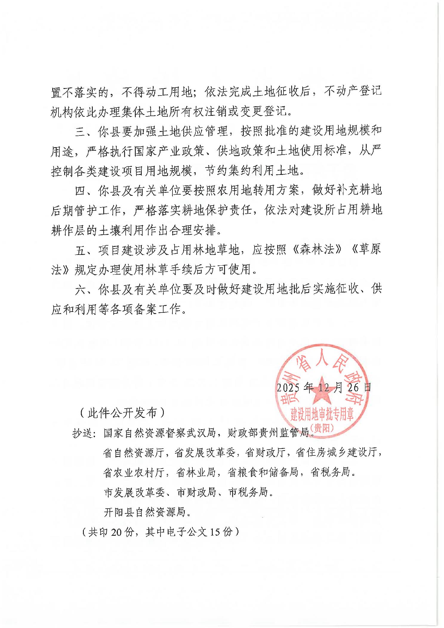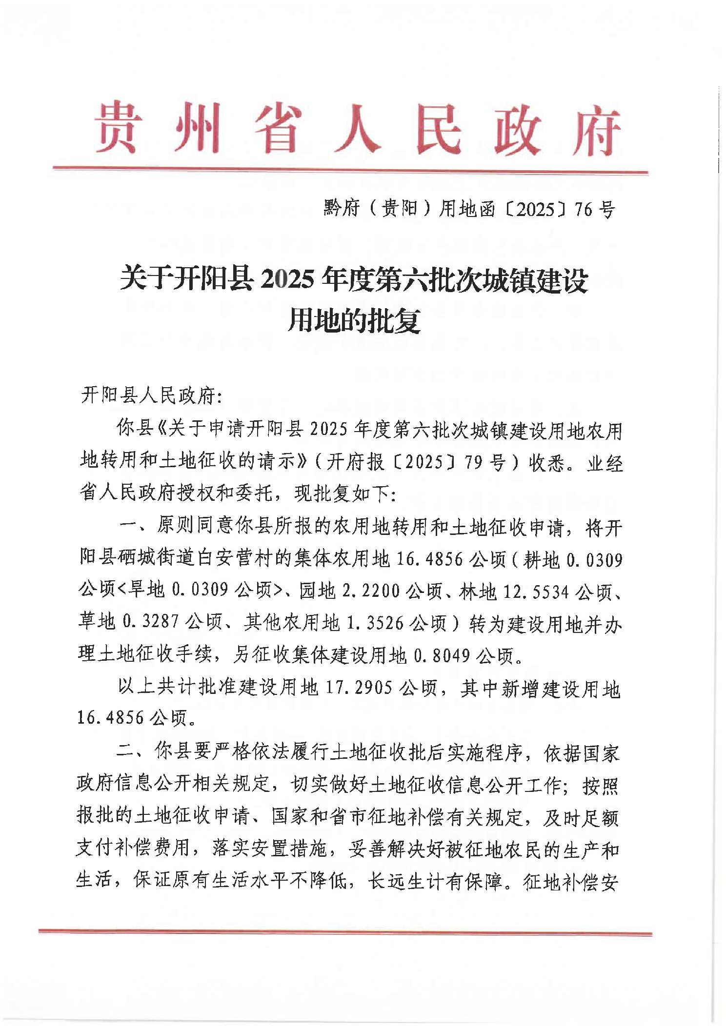 黔府(贵阳)用地函〔2025〕76号 关于开阳县2025年度第六批次城镇建设用地的批复