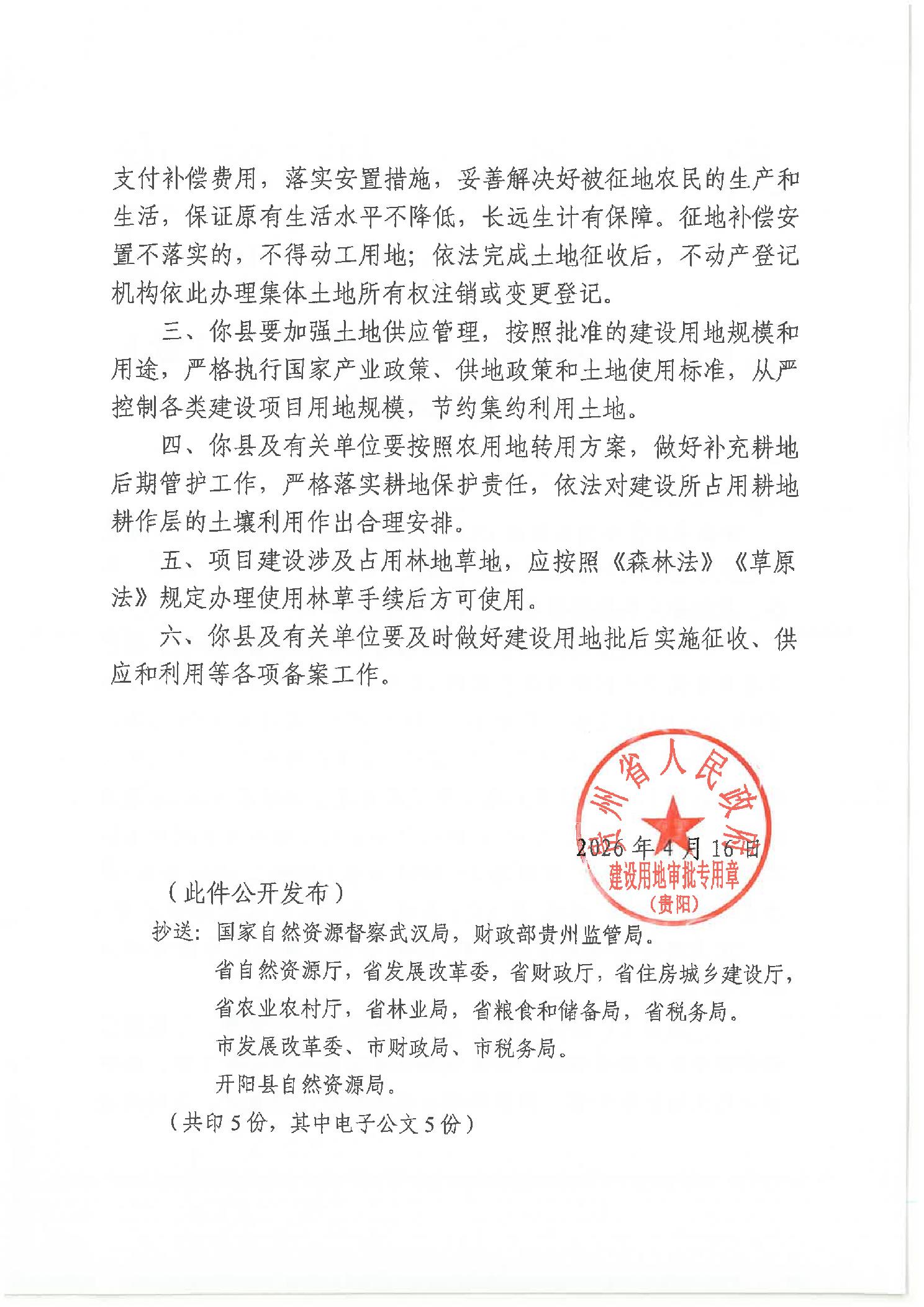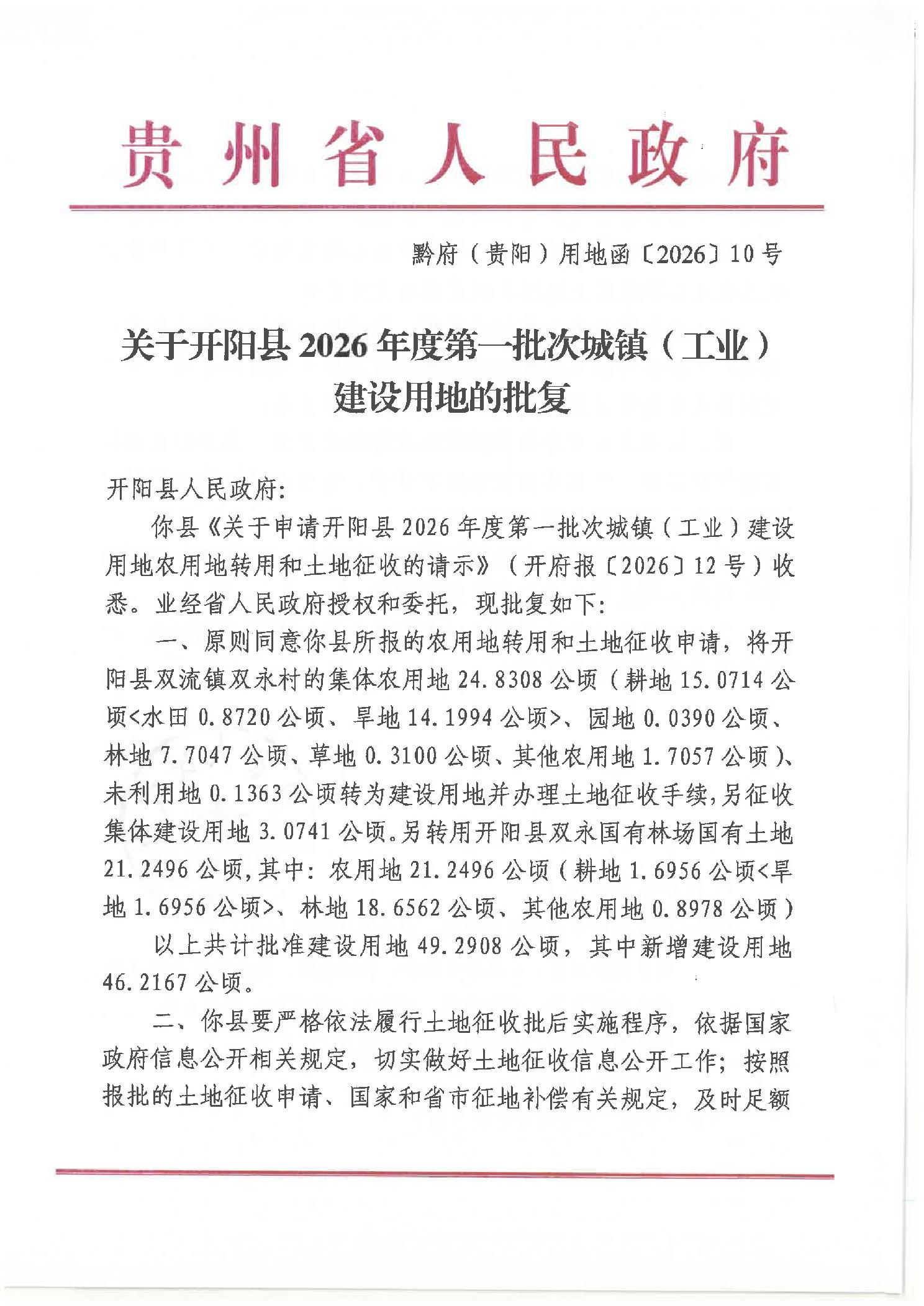 黔府(贵阳)用地函〔2026〕10号 关于开阳县2026年度第一批次城镇(工业)建设用地的批复