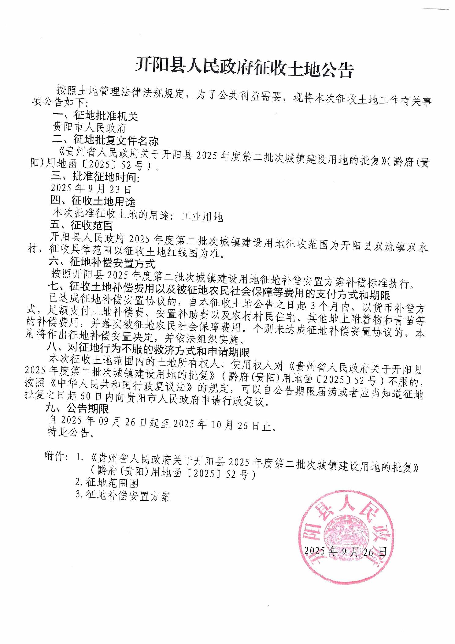 开阳县人民政府征收土地公告(开阳县2025年度第二批次城镇建设用地)