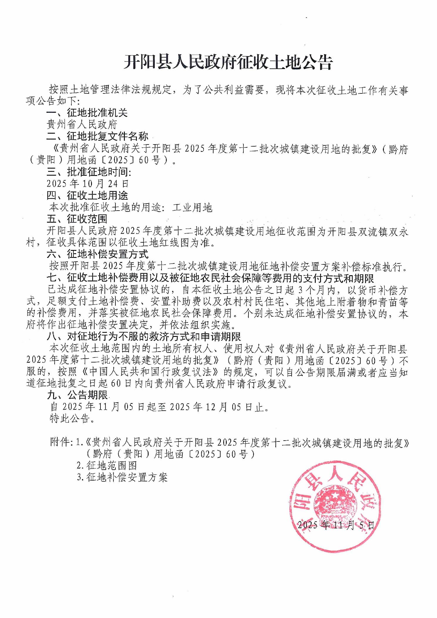 开阳县人民政府征收土地公告(开阳县2025年度第十二批次城镇建设用地)