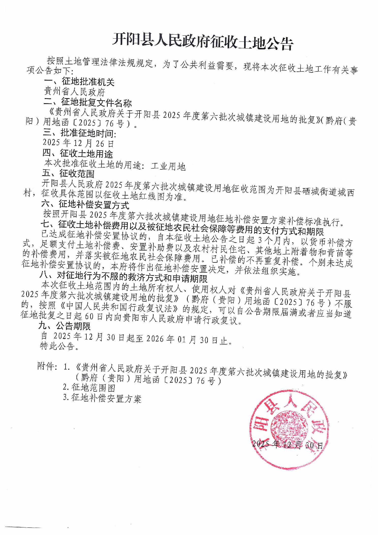 开阳县人民政府征收土地公告(开阳县2025年度第六批次城镇建设用地)