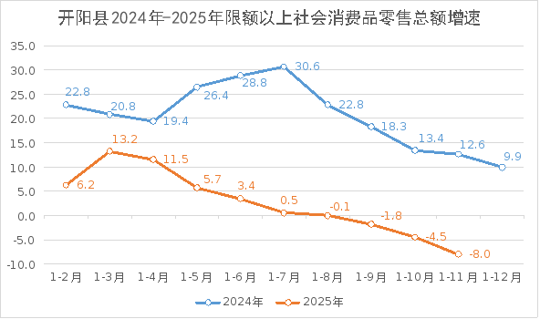 三、限上消费略有回落。1-11月,全县限额以上社会消费品零售总额完成32833万元,同比下降8.0%。其中,限上餐饮业营业额同比增长12.8%。