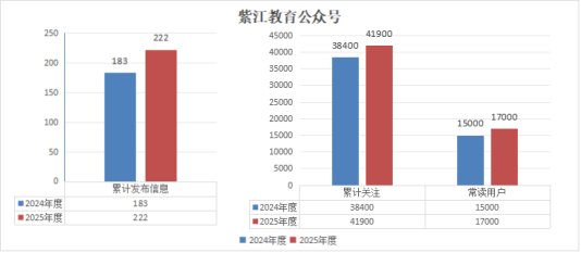 二是加大新媒体建设力度,切实提高教育宣传效率。积极加强本单位政务新媒体建设,围绕学校办学特色、教师招考、教育教学改革、校园安全等内容,累计发布教育信息419条,较上年同期增加7.2%。累计关注3.5万人,较上年同期增加20.7%,常读用户数达1.4万余人,较上年同期增加27.3%。